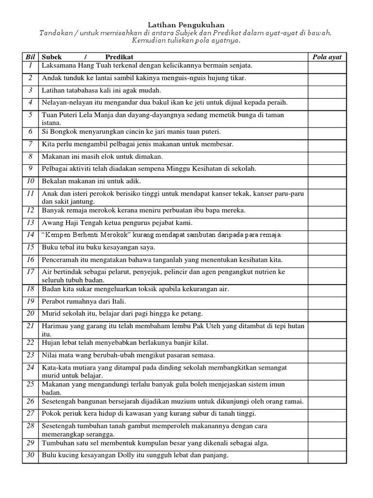 Latihan Subjek Dan Predikat Spm : 75%(4)75% found this document useful (4 votes).. Ii] sejak di bangku sekolah lagi abang terkenal dengan sikapnya yang ringan tulang. Kamu ditangkap polisi dan polisi menangkap kamu memiliki pelaku/aktor yang sama, yaitu polisi sedangkan subjeknya berbeda: Berada di belakang predikat dan didahului oleh preposisi/kata depan (di, ke, dari. This is latihan subjek & predikat by vet online education on vimeo, the home for high quality videos and the people who love them. Haji abdullah mengait buah rambutan itu menggunakan sebatang galah.