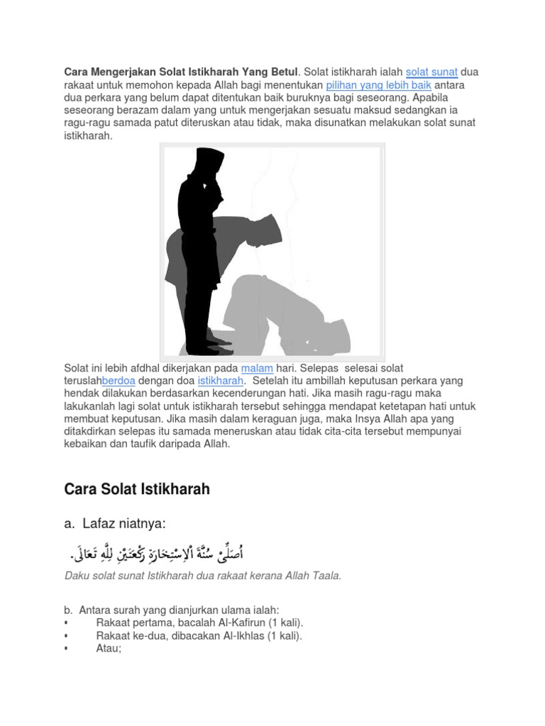 Karena sejatinya manusia adalah makhluk yang lemah. Silahkan melaksanakan shalat istikharah untuk menentukan pilihan yang sulit agar allah yang. Lafaz niat pertama sekali untuk solat adalah lafaz niat. Tata cara shalat istikharah, bacaan niat, cara pelaksanaan, waktu, dan doanya, ditulis dalam tulisan arab, latin dan artinya. Bayangkan jika dilamar oleh dua jejaka, macam mana mahu buat pilihan?