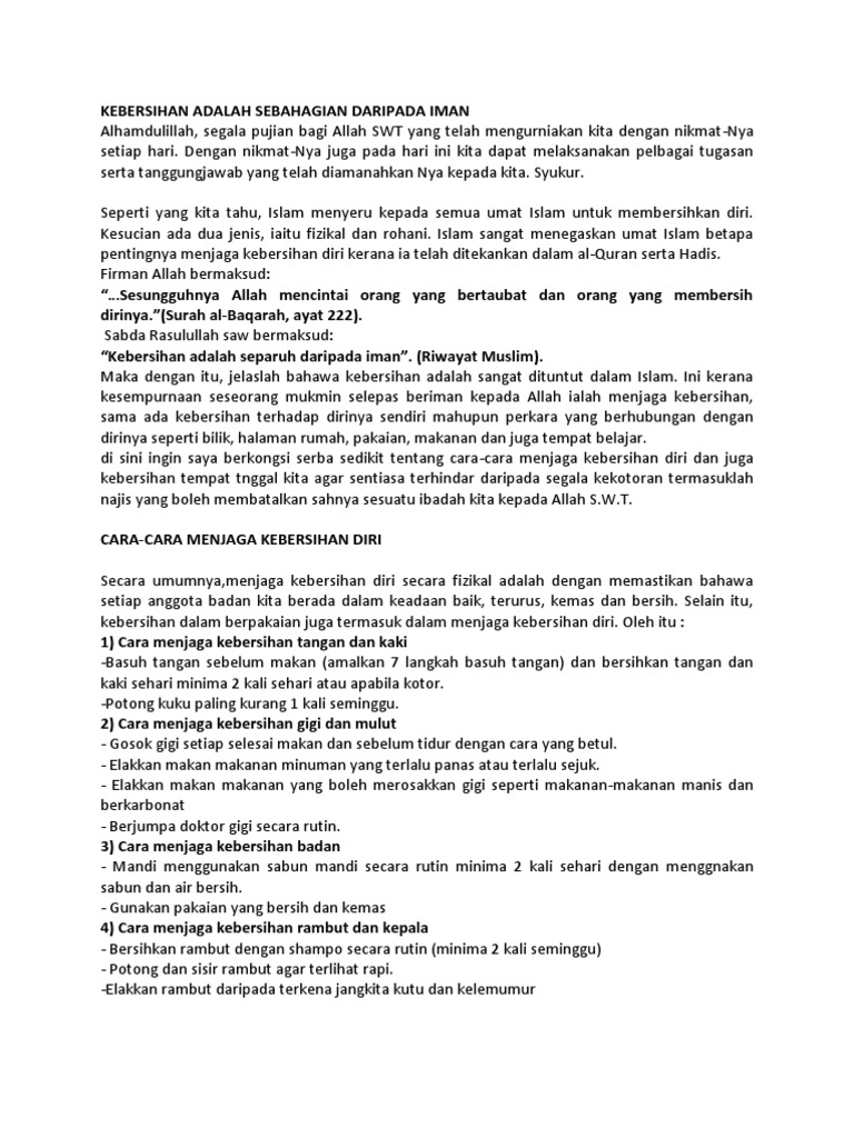 Kebersihan Diri from image.slidesharecdn.com Bersuci (thaharah) itu setengah daripada iman. Selain mengajarkan kebersihan fisik, dalam islam juga mengajarkan kebersihan batin. Dengan memberikan perhatian kepada beberapa riwayat daripada nabi nabi (s.a.w). Iman sumber kebersihan atau kebersihan itu membentuk bahagian dari iman tersebut. Mandi itu adalah sebahagian wajib ke atas setiap orang islam yang mana pada setiap tujuh ahri satu har daripadanya wajib membasuh kepala dan. Berpidato tentang kebersihan sangat bagus disampaikan kepada khalayak umum, karena di indonesia sendiri kebersihan sangat memprihatikan. Lượt xem 3,4 n7 năm trước. Kalau ada shahihkah atau tidak ?